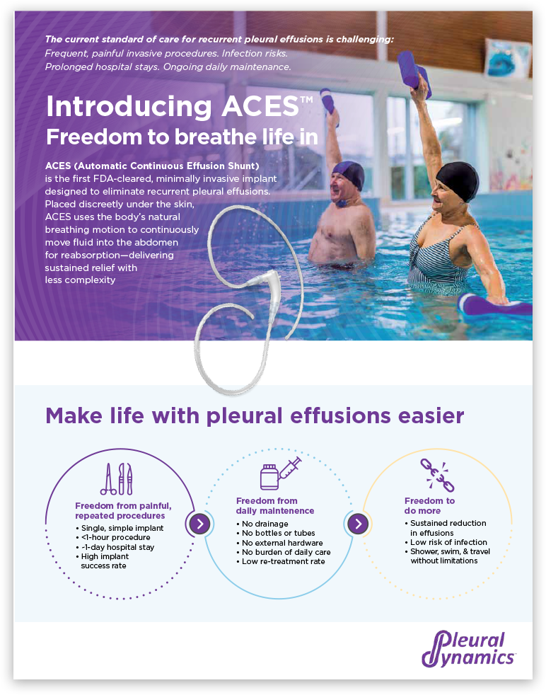 Recurrent pleural effusion—chronic fluid buildup around the lungs—forces thousands of patients into a cycle of pain, breathlessness, and repeated hospital visits. For many, it means invasive procedures, infection risks, and ongoing daily maintenance. Pleural Dynamics, a MedTech innovator, set out to change that. Their breakthrough device, ACES™ (Automatic Continuous Effusion Shunt), was the first FDA-cleared, minimally invasive implant designed to eliminate recurrent pleural effusions using the body’s own breathing motion. But the brand needed a story and visual identity that matched the scale of its innovation—one that could shift the mindsets of thoracic surgeons, clinical decision-makers, and patients.